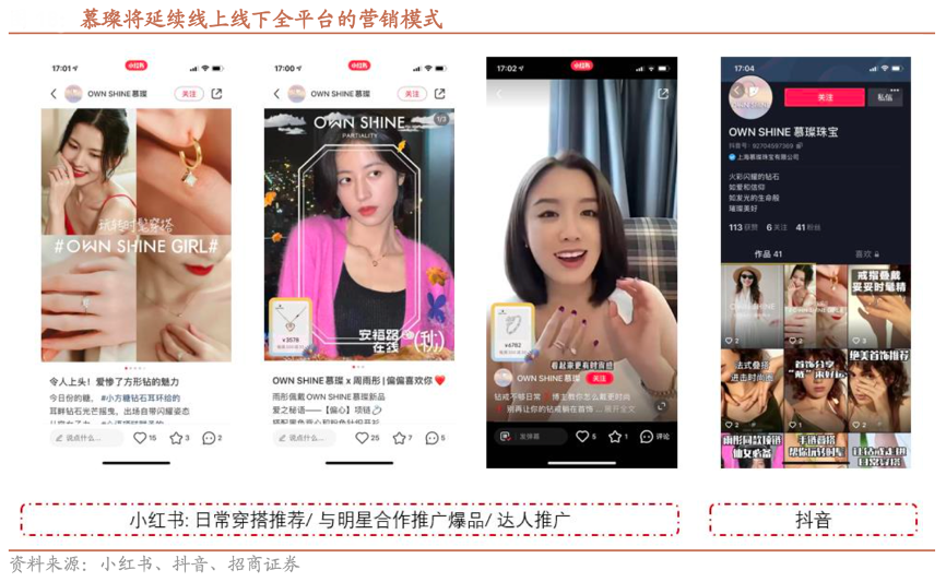 經(jīng)典案例:根據(jù)小紅書、抖音、招商證券等綜合資訊表明,對應(yīng)慕璨品牌借助曼卡龍策略,在營銷模式上其借鑒主品牌經(jīng)營經(jīng)驗,目前也在多個線上平臺進(jìn)行內(nèi)容營銷,以提升品牌的影響力以及消費者對品牌的認(rèn)知程度,其中,注重內(nèi)容傳播優(yōu)勢的小紅書是目前品牌營銷的主戰(zhàn)場。作為時髦傳達(dá)的品牌,小紅書和抖音平臺上慕璨推出多種搭配方式,多產(chǎn)品與服裝的搭配融為一體,進(jìn)一步深化消費者對培育鉆石的品牌接受度。