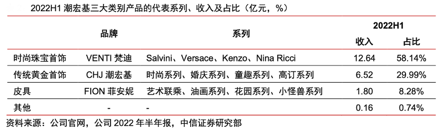 經(jīng)典案例:根據(jù)公司官網(wǎng)、公司2022年半年報(bào)、中信證券研究部等綜合資訊表明,潮宏基三大業(yè)務(wù)形成傳統(tǒng)與時(shí)尚共存的產(chǎn)品矩陣。目前,潮宏基主要產(chǎn)品包括時(shí)尚珠寶首飾、傳統(tǒng)黃金首飾和皮具,形成了 CHJ 潮宏基、VENTI 梵迪、FION 菲安妮三大品牌的時(shí)尚生態(tài)圈。截至 2022H1,公司營(yíng)業(yè)收入 21.74 億元,其中,時(shí)尚珠寶首飾收入 12.64 億元,占比 58.14%。