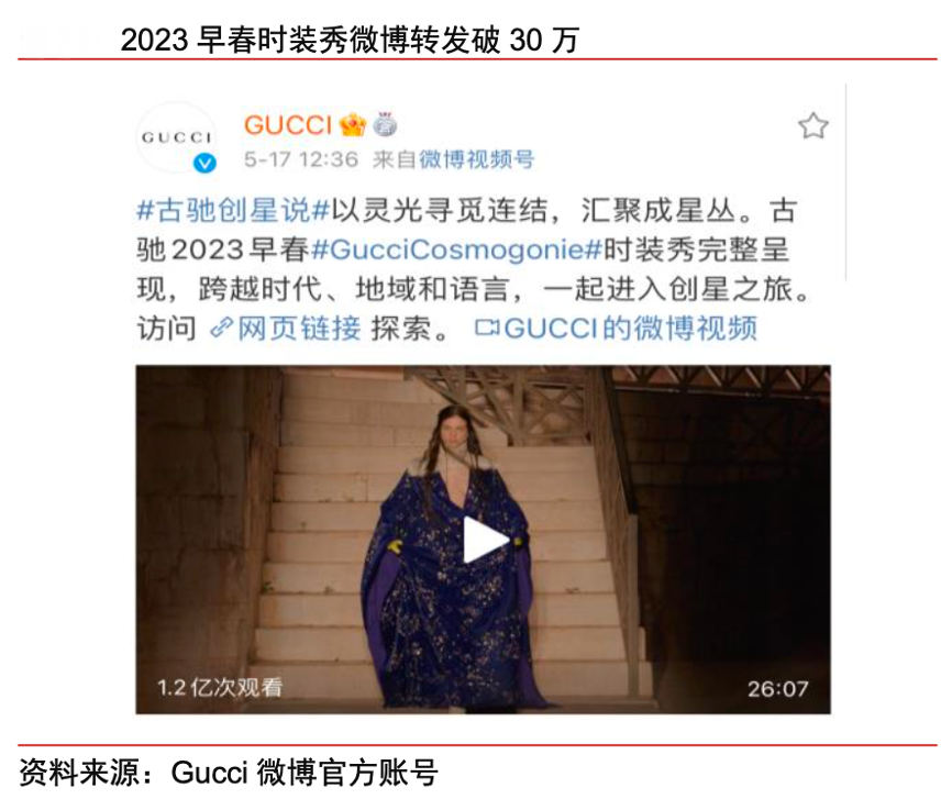 經(jīng)典案例:根據(jù)Gucci微博官方帳號(hào)、中信證券研究部等綜合資訊表明,Gucci除產(chǎn)品設(shè)計(jì)年輕化外,Gucci 亦通過社交媒體等數(shù)字化渠道搶占千禧一代心智,國內(nèi)外分別以千禧一代最為集中的 Instgram 和微博為主要陣地進(jìn)行投放,通過官方、KOL 種草助力品牌破圈;在中國市場(chǎng),品牌所有營銷大事件都配合微博進(jìn)行話題流量投放,獲取了較高的討論熱度,2023 早春時(shí)裝秀獲多位一線明 星轉(zhuǎn)發(fā),累計(jì)播放量超 1.2 億次,轉(zhuǎn)發(fā)量超 30 萬。