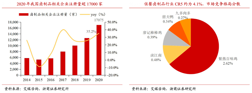 經(jīng)典案例:根據(jù)艾媒咨詢、浙商證券研究所等綜合資訊表明,紫燕百味雞龍頭地位顯著,市場(chǎng)份額超過其他四個(gè)品牌的總和,2019 年我國佐餐鹵制品行業(yè) CR5 約為 4.1%,紫燕百味雞市占率為 2.62%,2020 年為 2.82%,上升0.2pct。
