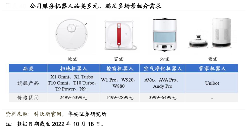 經(jīng)典案例:根據(jù)科沃斯官網(wǎng)、華安證券研究所等綜合資訊表明,科沃斯公司 ToC 產(chǎn)品品類包括掃地 機(jī)器人(地寶)、擦窗機(jī)器人(窗寶)、空氣凈化機(jī)器人(沁寶)和管家機(jī)器人(親寶) 四類,可滿足家庭生活中不同場(chǎng)景的細(xì)分需求。其中,掃地機(jī)器人是服務(wù)機(jī)器人板塊中主力品類,貢獻(xiàn)服務(wù)機(jī)器人業(yè)務(wù)90%以上營(yíng)收。