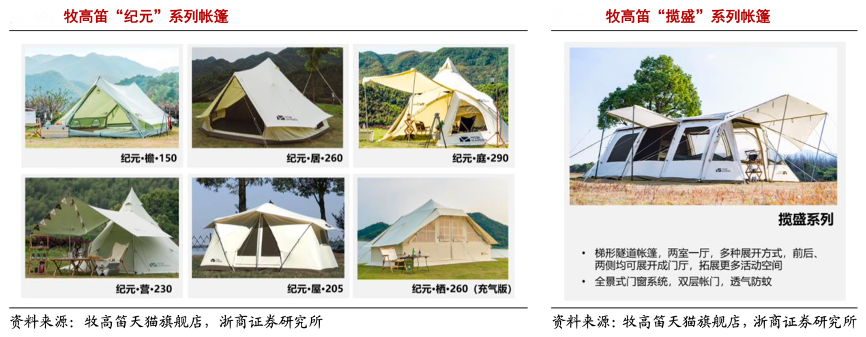 經(jīng)典案例:根據(jù)牧高笛天貓旗艦店、浙商證券研究所等綜合資訊表明,牧高笛公司于 2020 年推出“紀(jì)元”系列,定位高端精致露營(yíng)市場(chǎng),相比于傳統(tǒng)戶外帳篷,紀(jì)元系列帳篷內(nèi)部空間大幅擴(kuò)大,高度達(dá)到 1.8-2.9 米,可以展開(kāi)前廳,使用者可以在帳篷內(nèi)烹飪,契合精致露營(yíng)場(chǎng)景的獨(dú)特需求。2021 年公司推出“攬盛”梯形隧道帳篷,活動(dòng)空間更大且利用率高,上市后始終占據(jù)銷量前列,多次追加補(bǔ)單,成為公司另一大爆款產(chǎn)品。