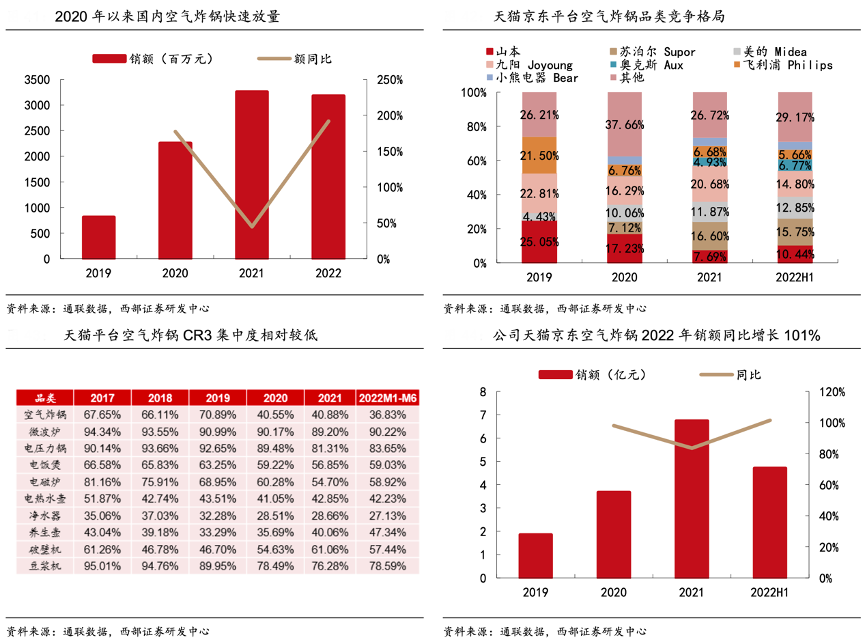 經(jīng)典案例:根據(jù)通聯(lián)數(shù)據(jù)、西部證券研發(fā)中心等綜合資訊表明,2020年國內(nèi)空炸市場開始快速放量,九陽公司先后推出大容量可視空炸、免翻面空炸等有效解決用戶痛點(diǎn)的產(chǎn)品,憑借強(qiáng)大的產(chǎn)品力穩(wěn)居國內(nèi)龍頭地位。根據(jù)通聯(lián)數(shù)據(jù),2021 年公司空炸在京東天貓平臺(tái)合計(jì)實(shí)現(xiàn)銷額 6.73 億元,同比增 長 83.5%,2022 年 1-6 月實(shí)現(xiàn)銷額4.71 億元,同比增長 101.4%。