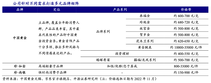 經(jīng)典案例:根據(jù)中國黃金公眾號、中國黃金官網(wǎng)、開源證券研究所等綜合資訊表明,中國黃金公司以“中國黃金”為主品牌,主打投資金條、金飾產(chǎn)品,覆蓋老中青全年齡層消費人群。同時其精準定位年輕女性客群,2012 年推出主打高端輕奢產(chǎn)品的珍·如金品牌,2014 年推出定位快時尚產(chǎn)品的珍·尚銀品牌,旨在通過豐富品牌矩陣、進行差異化布局以滿足更廣泛客群的多樣化需求。