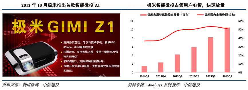 經(jīng)典案例:根據(jù)新浪微博、Analysys易觀智庫、中信建投等綜合資訊表明,極米通過顛覆式創(chuàng)新開創(chuàng)家用智能投影品類,初創(chuàng)團隊將 LED 光源應用 于投影儀,解決燈泡耗材問題;開發(fā) GMUI 系統(tǒng),解決內(nèi)容互聯(lián)問題;發(fā)明自動對焦系統(tǒng),解決產(chǎn)品調(diào)試問題; 重新定義家用投影儀產(chǎn)品,智能投影走入千家萬戶。從 Z1 到 Z3,以及軟件系統(tǒng)都經(jīng)歷反復的調(diào)校和改進,2014 年 4 月才正式對外發(fā)布第一代量產(chǎn)產(chǎn)品極米 Z3。在資本助推下,極米正式進入量產(chǎn)階段,同時補足內(nèi)容端和渠 道端缺口,極米智能微投銷量快速提升。