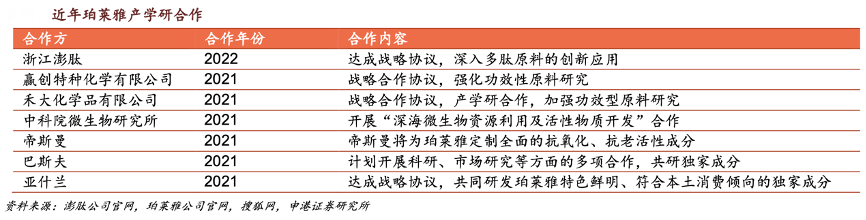 經(jīng)典案例:根據(jù)澎肽公司官網(wǎng)、珀萊雅公司官網(wǎng)、搜狐網(wǎng)、申港證券研究所等綜合資訊表明,珀萊雅捕捉到消費(fèi)者對(duì)于護(hù)膚品成分關(guān)注度的提升,與海內(nèi)外研發(fā)實(shí)驗(yàn)室開(kāi)展原料研發(fā)合作。2022年珀萊雅與浙江澎肽展開(kāi)戰(zhàn)略合作,深入多肽研發(fā)、多肽綠色合成等方面的創(chuàng)新研發(fā)。2021 年與贏創(chuàng)特種、禾大化學(xué)、中科院微生物研究所、帝斯曼、巴斯夫、亞什蘭開(kāi)展合作,共同研發(fā)優(yōu)質(zhì)原料與科學(xué)配方。