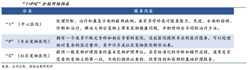 經(jīng)典案例:根據(jù)公司公告、國金證券研究所等綜合資訊表明,新瑞鵬公司建立“1+P+C”(“1”:綜合性寵物醫(yī)院;“P”:??茖櫸镝t(yī)院;“C”:社區(qū)寵物醫(yī)院)寵物醫(yī)院網(wǎng)絡(luò)和轉(zhuǎn)診系統(tǒng),以滿足不同層級的醫(yī)療需求。