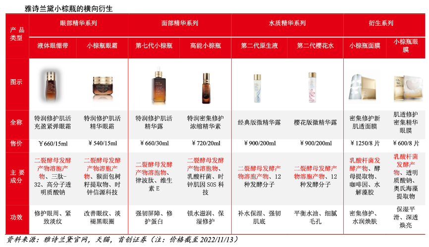 經(jīng)典案例:根據(jù)雅詩蘭黛官網(wǎng)、天貓、首創(chuàng)證券等綜合資訊表明,雅詩蘭黛及蘭蔻均在大單品精華的基礎上橫向衍生出水、面霜、眼 霜、面膜等產(chǎn)品。對于公司,衍生的產(chǎn)品能夠賦予品牌以更高的關注度,同時通過疊用增加使用效果,提高客單價。