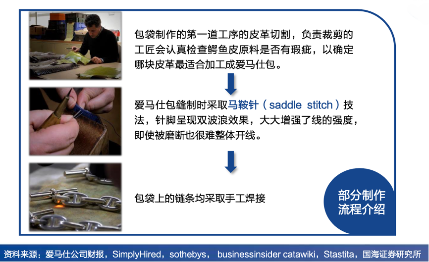 經(jīng)典案例:根據(jù)愛馬仕公司財(cái)報(bào)、SimplyHired、sothebys、businessinsider catawiki、Stastita、國(guó)海證券研究所等綜合資訊表明,愛馬仕始終堅(jiān)持精心手工制作每一件包袋和絲綢,以滿足客戶的個(gè)性化定制需求。由于整個(gè)制作流程均由人工完成,制作一個(gè)Kelly包平均約需要 25小時(shí),一個(gè)Birkin包至少需要18小時(shí),一個(gè)制造廠每月僅能生產(chǎn)15只 愛馬仕包。