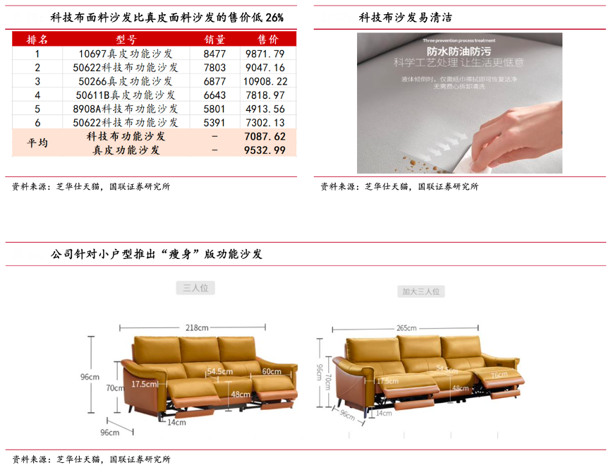 經(jīng)典案例:根據(jù)芝華仕天貓、國聯(lián)證券研究所等綜合資訊表明,敏華控股公司推出科技布功能沙發(fā)和小戶型功能沙發(fā),提高功能沙發(fā)滲透率。天貓旗艦店端統(tǒng)計的科技布沙發(fā)比真皮沙發(fā)價格低 26%左右。同時公司針對小戶型研發(fā)出適用性更強的“瘦身版”功能沙發(fā),由于使用的原料更少,價格也比同型號、同座數(shù)的中大戶型沙發(fā)低12.5%。