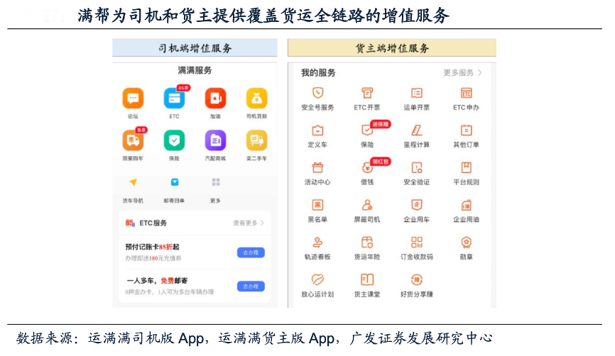經(jīng)典案例:根據(jù)運(yùn)滿滿司機(jī)版APP、運(yùn)滿滿貨主版APP、廣發(fā)證券發(fā)展研究中心等綜合資訊表明,滿幫提供一系列增值服務(wù),完善貨運(yùn)場(chǎng)景全鏈路的服務(wù)閉環(huán)。托運(yùn)人可以在滿幫平臺(tái)上訪問(wèn)運(yùn)輸管理系統(tǒng)、信貸服務(wù)和保險(xiǎn)服務(wù);司機(jī)可以在滿幫平臺(tái)上管理交通罰單記錄,訪問(wèn)信用解決方案、享受保險(xiǎn)服務(wù)、ETC服務(wù)和加油服務(wù)等。截至2021年12月31日,約有300萬(wàn)用戶至少使用了滿幫的一項(xiàng)增值服務(wù)。