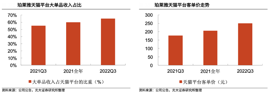 優(yōu)秀案例:根據(jù)公司公告、光大證券研究所等綜合資訊表明,在國(guó)貨崛起的趨勢(shì)下,近年來(lái)國(guó)貨品牌亦在通過(guò)大單品戰(zhàn)略實(shí)現(xiàn)品牌破圈。以珀萊雅和貝泰妮為例,珀萊雅自 2020 年以來(lái)推出了紅寶石精華、雙抗精華、源力精華等多款大單品,2022 年 10 月三款精華分別為珀萊雅天貓旗艦店貢獻(xiàn)了約 5%、10%、5%的銷售額,根據(jù)公司公告,珀萊雅天貓平臺(tái)中大單品的收入占比 由 2021Q3 的 55%提升至 2022Q3 的超 65%,天貓平臺(tái)總體客單價(jià)由2021Q3 的 176 元提升至 2022Q3 的超 250 元。