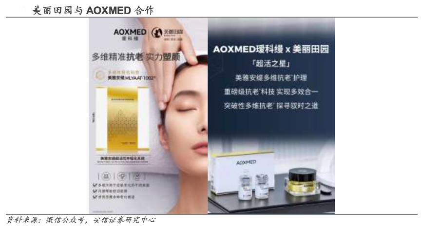 經(jīng)典案例:根據(jù)微信公眾號(hào)、安信證券研究中心等綜合資訊表明,美麗田園與 AOXMED 強(qiáng)強(qiáng)聯(lián)手,推出特色皮膚管理項(xiàng)目。2023 年 2 月 28 日,美麗田園宣布與貝泰妮旗下奢侈科技護(hù)膚品牌 AOXMED 合作推出“超活之星”美亞安緹多為抗老皮膚護(hù)理項(xiàng)目。通過與 AOXMED 強(qiáng)強(qiáng)聯(lián)手,實(shí)現(xiàn)項(xiàng)目賦能,進(jìn)一步提升品牌知名度。