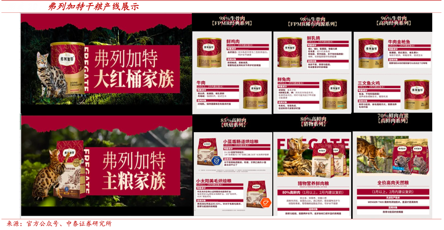 經(jīng)典案例:根據(jù)官方公眾號(hào)、中泰證券研究所等綜合資訊表明,弗列加特秉承開發(fā)少量、創(chuàng)新、精致、差異化的產(chǎn)品模式塑造品牌的高端形象。弗列加特每次推出的新產(chǎn)品、新口味都具有創(chuàng)新性和針對(duì)性。如近期新推出的小藍(lán)盾系列旨在改善貓咪腸道健康,緩解軟便和口臭的問題。