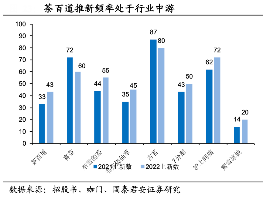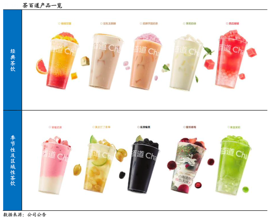 經(jīng)典案例:根據(jù)招股書、咖門、國泰君安證券研究等綜合資訊表明,茶百道公司持續(xù) 對消費者口味喜好的變化趨勢進行調(diào)研與預(yù)判,通常每隔幾個月即上新季節(jié)限定款或區(qū)域限定款產(chǎn)品的方式持續(xù)為消費者帶來新穎、驚喜的茶飲體驗。2023 年,茶百道開發(fā)出約 250 多款產(chǎn)品,并推出了 48 款新品,升級了 13 款產(chǎn)品,飽受消費者好評。