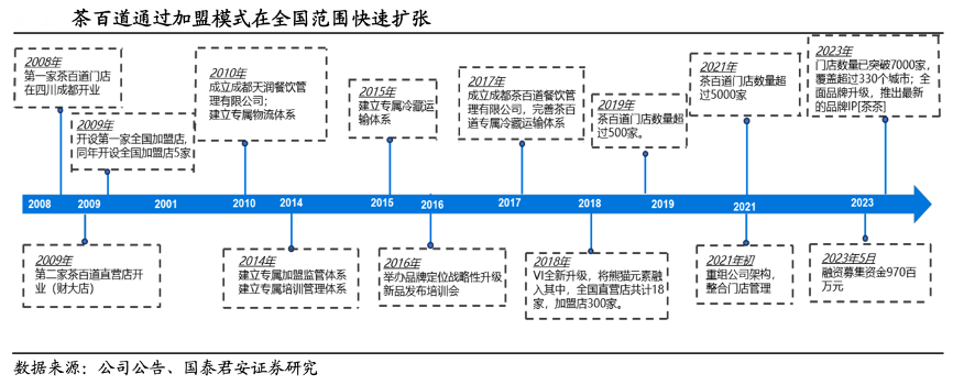 經(jīng)典案例:根據(jù)公司公告、國泰君安證券研究等綜合資訊表明,茶百道 2008 年誕生于成都,通過加盟模式在全國范圍快速擴張。2019 年至 2021 年,在茶飲連鎖加盟浪潮下,茶百 道門店數(shù)量從 500 多家快速增長至超過 5000 家。2023 年 6 月,茶百道 完成新一輪融資,募資約 10 億元資金,領(lǐng)投方為蘭馨亞洲,跟投方包括 正心谷、草根知本、中金、番茄資本,投后估值接近 180 億元。
