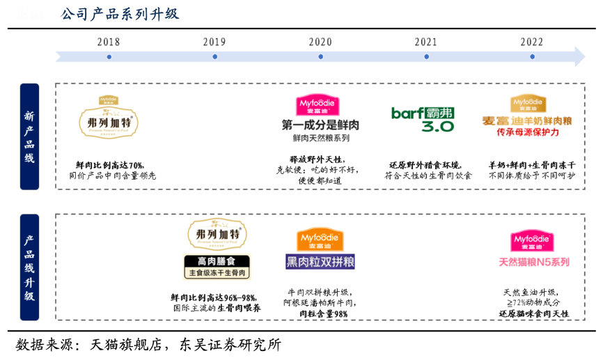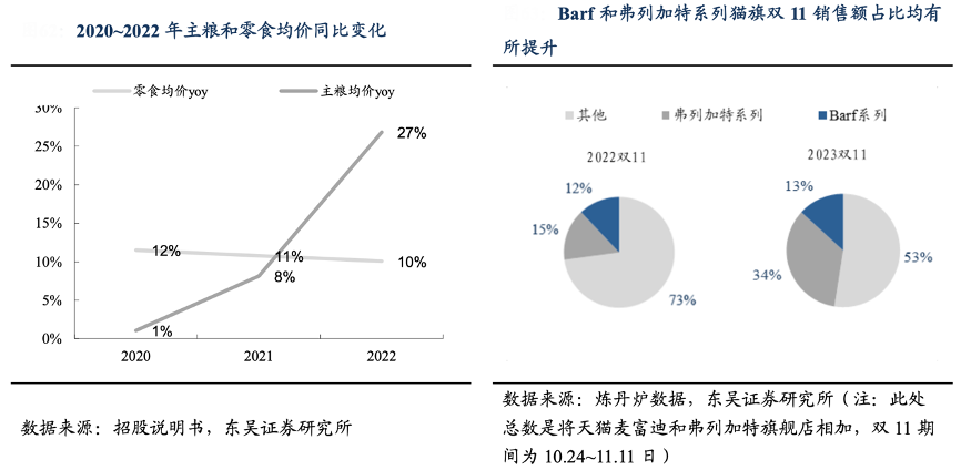 經(jīng)典案例:根據(jù)招股說(shuō)明書、煉丹爐數(shù)據(jù)、、東吳證券研究所等綜合資訊表明,乖寶寵物隨著成分配方優(yōu)化和新產(chǎn)品線的推出均價(jià)趨于提升,產(chǎn)品均價(jià)趨于提升,2020-2022 年,公司主糧/零食/保健品及其他的 均價(jià)分別提升了 37%/22%/52%。其中,麥富迪的高端系列“Barf 系列”和高端貓糧“弗 列加特系列”均表現(xiàn)突出。