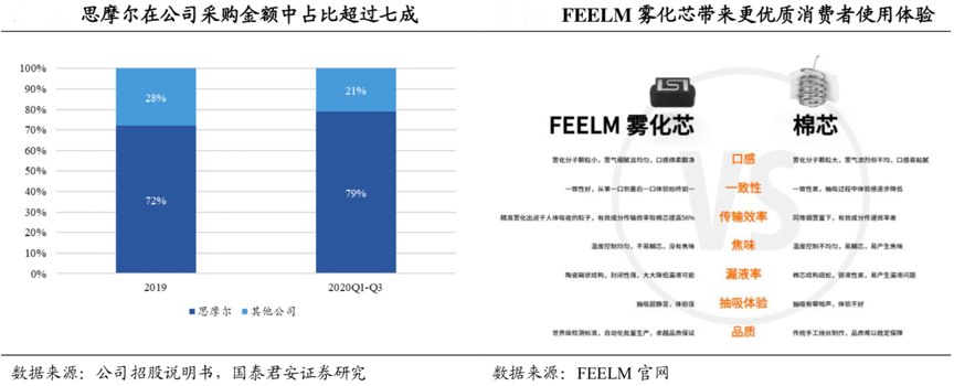 經(jīng)典案例:根據(jù)公司招股說(shuō)明書、FEELM官網(wǎng)、國(guó)泰君安證券研究等綜合資訊表明,霧芯科技公司 2019 年總采購(gòu)額中與思摩爾發(fā)生的采購(gòu)金額占比 72%,2020 年前三季度占比 79%。思摩爾國(guó)際為全球電子霧化行業(yè)龍頭,2019年全球市占率高達(dá)16.5%,其主打的陶瓷霧化技術(shù)黑科技“Feelm”,將金屬薄膜與陶瓷導(dǎo)體相結(jié)合,提升87.58%傳遞效率,可超寬幅加熱,讓液體變?yōu)橹睆叫∮?nbsp;1μm 的氣溶膠粒子,帶來(lái)更高傳輸效率,在煙草口味還原、煙霧量、升溫速度上帶給消費(fèi)者更優(yōu)質(zhì)的使用體驗(yàn)。