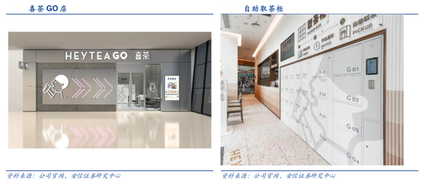 經(jīng)典案例:根據(jù)公司官網(wǎng)、安信證券研究中心等綜合資訊表明,喜茶GO店主 要針對自提帶走或外賣需求,店內(nèi)設有自提柜,消費者在線上 APP 點餐,產(chǎn)品制備完成后會存放在店內(nèi)自提柜中,顧客在手機上收到通知后即可到店自提,店內(nèi)干凈簡約,設有快速等位區(qū)域,弱化門店社交功能,引導提前線上點餐和自提外帶,有助于提升單店盈利能力。