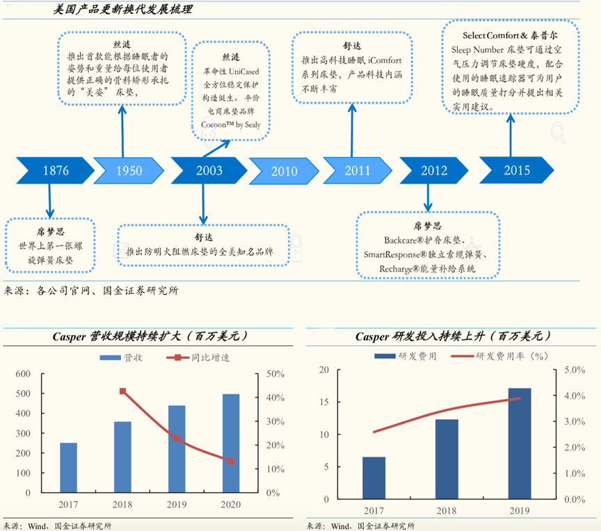 經(jīng)典案例:根據(jù)各公司官網(wǎng)、wind、國金證券研究所等綜合資訊表明,近年來,國外品牌 Casper 快速發(fā)展,近年來其逐步提高研發(fā)費用,研發(fā)創(chuàng)新一方面使得 Casper 床墊將頂層的優(yōu)質(zhì)乳膠泡沫和中間層的優(yōu)質(zhì)記憶泡沫融合 在一起,確保身體在睡眠過程中不同角度的支撐和舒適度,產(chǎn)品體驗感領(lǐng)先同行,另一方面設(shè)計使得 Casper 床墊可用迷你冰箱尺寸的箱子包裝運輸,顯著降低運輸成本。