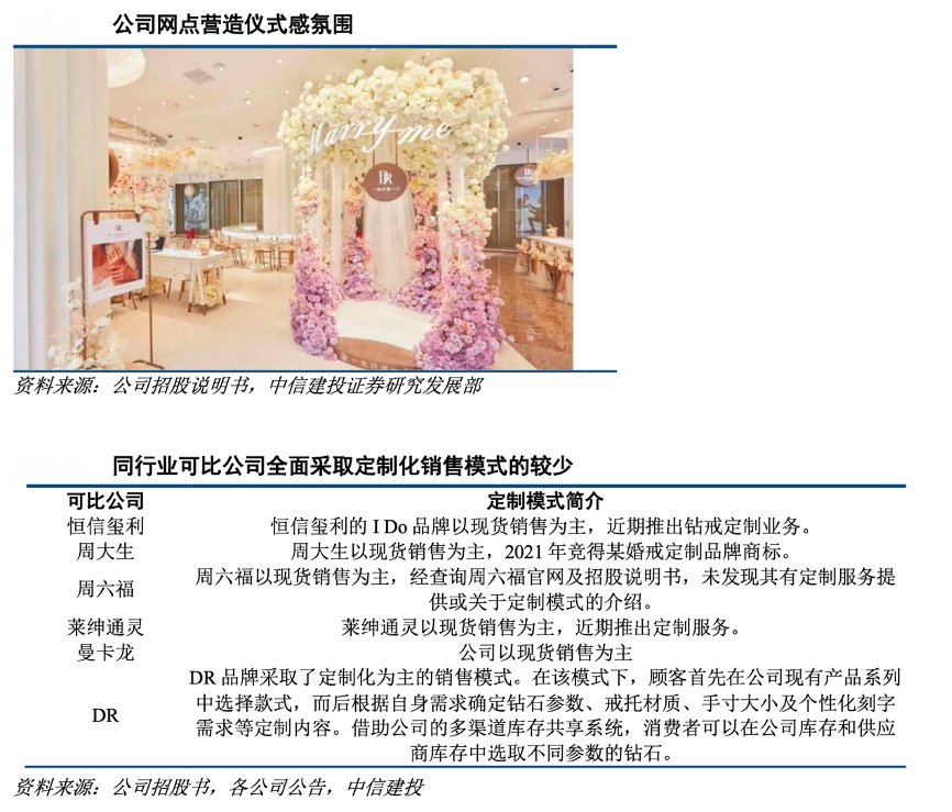 經(jīng)典案例:根據(jù)公司招股說明書、各公司公告、中信建投證券研究發(fā)展部等綜合資訊表明,產(chǎn)品定制化同時,迪阿股份公司門店端進(jìn)行情景化布置進(jìn)一步提升消費者體驗。其在線下網(wǎng)點的裝修會主要營造 浪漫的場景,進(jìn)一步提高消費者體驗,同時可按照消費者需求提供訂婚儀式等服務(wù),全方位、全流程為消費者提升購物體驗。