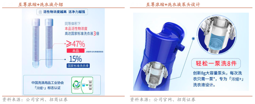 經(jīng)典案例:根據(jù)公司官網(wǎng)、招商證券等綜合資訊表明,藍(lán)月亮公司在普通洗衣液、濃縮洗衣液和洗衣助劑領(lǐng)域有完整布局,在 1993 年藍(lán)月亮品牌創(chuàng) 立之初就推出了衣領(lǐng)凈產(chǎn)品,在 2008 年推出的深層潔凈護(hù)理洗衣液,在2015 年推出至尊濃縮+洗衣液。至尊濃縮+洗衣液活性物濃度高達(dá) 47%,獲得中國洗協(xié)“濃縮+”標(biāo)志認(rèn)證,與國家標(biāo)準(zhǔn)洗衣液相比用量可減少 82.5%,在包裝瓶設(shè)計(jì)上更為人性化、便利化,精準(zhǔn)量取、噴嘴干凈并且減少瓶內(nèi)余液量,利用技術(shù)打造產(chǎn)品,改善用戶體驗(yàn)。
