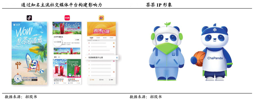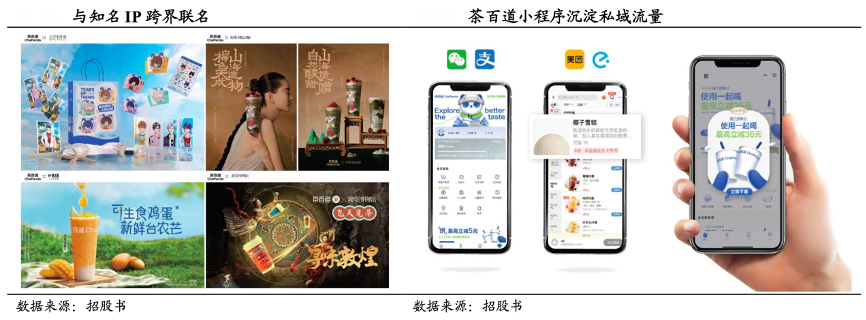經(jīng)典案例:根據(jù)招股書、國(guó)泰君安證券研究等綜合資訊表明,數(shù)字化營(yíng)銷、IP 營(yíng)銷和品牌聯(lián)名建立茶百道強(qiáng)大的線上影響力。其通過微博、微信、小紅書、抖音、嗶哩嗶哩及快手等主流社交平臺(tái)獲客,通過抖音進(jìn)行線上直播和品牌營(yíng)銷吸引消費(fèi)者,抖音直播團(tuán)購獲得“穩(wěn)居全國(guó)帶貨團(tuán)購榜”、“茶飲品類直播 GMV”、“品牌專場(chǎng)轉(zhuǎn)化率”等多個(gè)行業(yè)第一。同時(shí)通過品牌 IP“茶茶”提升品牌形象,設(shè)計(jì)并推出“茶茶”表情包、“茶茶”特色創(chuàng)意商品,并與 KOL 及網(wǎng)紅進(jìn)行合作。