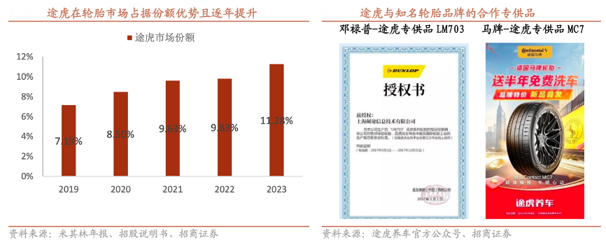 經(jīng)典案例:根據(jù)米其林年報(bào)、招股說(shuō)明書、途虎養(yǎng)車官方公眾號(hào)、招商證券等綜合資訊表明,途虎基于大量用戶洞察及反饋數(shù)據(jù),能夠?yàn)槠放粕淘谔峁┝闶矍赖幕A(chǔ)上進(jìn)一步反向推動(dòng)其改進(jìn)產(chǎn)品設(shè)計(jì)及性能,疊加強(qiáng)大的銷量保障,包括馬牌、鄧祿普、朝陽(yáng)輪胎在內(nèi)的諸多知名品牌合作途虎推出專供品。以德國(guó)馬牌為例,途虎作為馬牌在中國(guó)的首個(gè)網(wǎng)絡(luò)品牌授權(quán),于 2020 年起開(kāi)展協(xié)同產(chǎn)品研發(fā),推出馬牌 MC5、TC6 等途虎專供輪胎產(chǎn)品線。