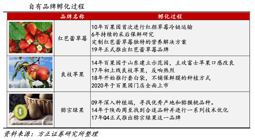經(jīng)典案例:根據(jù)方正證券研究等綜合資訊表明,百果園多年行業(yè)深耕經(jīng)驗(yàn)助力品牌孵化。以紅芭蕾草莓、良枝蘋果、獼宗綠果為例,這三款自有品牌招牌果在全面上市之前都經(jīng)歷多年培育、調(diào)整、優(yōu)化,紅芭蕾歷時(shí)九年,良枝蘋果歷時(shí)六年,獼宗綠果歷時(shí)八年。