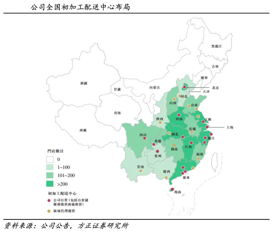 經(jīng)典案例:根據(jù)公司公告、方正證券研究所等綜合資訊表明,百果園根據(jù)水果特性建立了高效的倉配冷鏈體系。截至 2022H1 百果園及其區(qū)域代理在全國共運(yùn)營 29 個初加工配送中心,總建筑面積約為 194733 平方米,其中 34%初加工配送中心為冷鏈型。從果品入倉到出貨,公司實施全程的成熟度和新鮮度監(jiān)控,通過設(shè)立不同的溫區(qū),對不同果品進(jìn)行溫濕度等差異化管理。