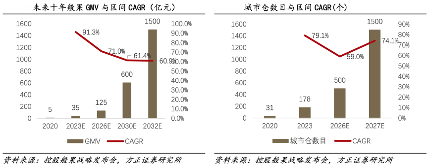 經(jīng)典案例:根據(jù)控股般果戰(zhàn)略發(fā)布會、方正證券研究所等綜合資訊表明,般果通過共享百果園的供應(yīng)鏈資源拓展上下游合作伙伴,并承接百果園水果標(biāo)準(zhǔn)體系、倉配物流、數(shù)字化建設(shè)、品牌打造、會員運(yùn)營等能力,為交易上下游賦能,擴(kuò)大交易規(guī)模、提升市場滲透率。般果平臺未來十年目標(biāo)為陸續(xù)完成全國五大總倉、1500個城市倉的布局。同時GMV達(dá) 1500 億元。更向代采交易+行業(yè) 咨詢交互平臺轉(zhuǎn)化,并不斷優(yōu)化盈利模型。