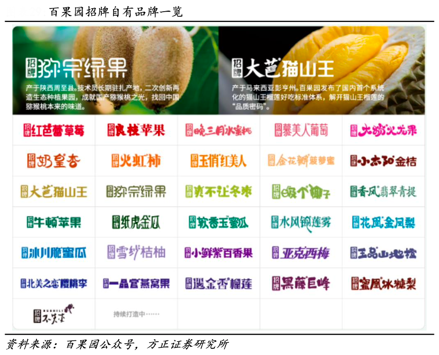 經(jīng)典案例:根據(jù)公司公告、公司官網(wǎng)、榜樣的力量公眾號、方正證券研究所等綜合資訊表明,百果園業(yè)務(wù)多元化發(fā)展,品牌戰(zhàn)略升級。2019 年發(fā)布“大生鮮” 戰(zhàn)略, 2023 年公司于港股上市,并控股般果平臺,全面布局“To B”業(yè)務(wù)。2024 年品牌戰(zhàn)略升級為“高品質(zhì)的水果專家和領(lǐng)導(dǎo)者”,計(jì)劃十年內(nèi)營收達(dá)到千億級別。