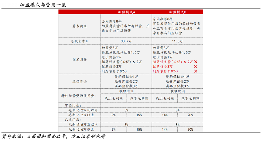 經(jīng)典案例:根據(jù)百果園加盟公眾號、方正證券研究所等綜合資訊表明,百果園“A+B”雙加盟模式+階梯式收取特許加盟費(fèi)降低加盟商經(jīng)營壓力。百果園目前的加盟模式分為 AB 兩種,差異主要在前期投入與后期毛利抽成方面。其中輕資產(chǎn)投入的加盟模式 B 更多提供給老加盟商。抽成方面百果園會通過租金、員工薪酬及消費(fèi)能力來劃分甲、乙兩類門店,根據(jù)加盟模式按照毛利額階梯式收取特許經(jīng)營資源使用費(fèi)。