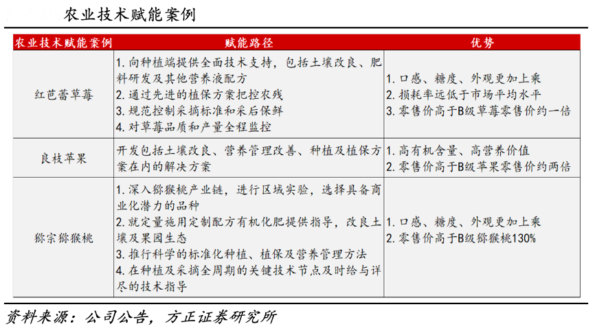 經(jīng)典案例:根據(jù)公司公告、方正證券研究所等綜合資訊表明,百果園通過向合作的種植基地推廣種植理念和種植與采后技術(shù),幫助種植基地培育優(yōu)質(zhì)果品,提升產(chǎn)量。百果園也以資本賦能擴(kuò)大優(yōu)質(zhì)基地的生產(chǎn)規(guī)模,獲得優(yōu)質(zhì)果品的優(yōu)先采購權(quán),確保大規(guī)模供應(yīng),并給予從龐大的銷售網(wǎng)絡(luò)獲取的市場信息,指導(dǎo)種植基地進(jìn)行品種的改良與創(chuàng)新。