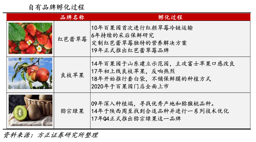 經(jīng)典案例:根據(jù)方正證券研究所等綜合資訊表明,以紅芭蕾草莓、良枝蘋果、獼宗綠果為例,這三款自有品牌招牌果在全面上市之前都經(jīng)歷多年培育、調(diào)整、優(yōu)化,紅芭蕾歷時九年,良枝蘋果歷時六年,獼宗綠果歷時八年。百果園深耕水果行業(yè)多年,在種植技術(shù)、品種選取、運(yùn)輸倉儲等方面積累了豐富經(jīng)驗(yàn),助力百果園的自有品牌孵化。