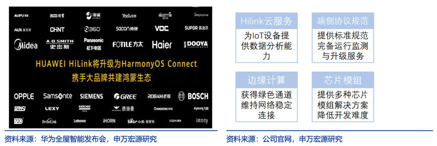 經(jīng)典案例:根據(jù)華為全屋智能發(fā)布會、申萬宏源研究等綜合資訊表明,作為硬件陣營的代表廠商,華為在鴻蒙系統(tǒng)、智能硬件方面具有突出優(yōu)勢,其智能設(shè)備則與其 他品牌合作接入,自身只提供電視等智能家居“入口”設(shè)備,相較小米等,底層控制能力更強(qiáng),連接更為穩(wěn)定;SDK支持 20 多個品類,1200 多萬個設(shè)備,鴻蒙 OS 開源提供 17 個子系統(tǒng),134 個代碼倉庫。