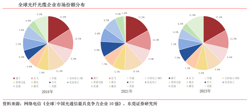 經(jīng)典案例:根據(jù)網(wǎng)絡(luò)電信《全球|中國(guó)光通信最具競(jìng)爭(zhēng)力企業(yè)10強(qiáng)》、東莞證券研究所等綜合資訊表明,光纖光纜行業(yè)各大廠商已經(jīng)歷多個(gè)通信周期建設(shè)的充分競(jìng)爭(zhēng),在 2023 年,全球前十大廠商占據(jù)光纖光纜市場(chǎng) 88.2%的市場(chǎng)份額。其中,長(zhǎng)飛光纖連續(xù)多年占據(jù)全球光纖光纜市場(chǎng)份額前三位,2023 年市場(chǎng)份額為 11.30%。