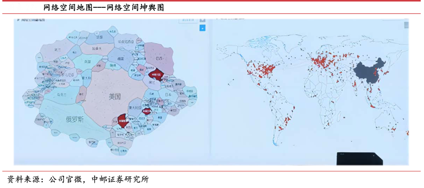經(jīng)典案例:根據(jù)公司官微、中郵證券研究所等綜合資訊表明,2022 年 9 月,盛邦安全發(fā)布并展示了首個(gè)網(wǎng)絡(luò)空間地圖——網(wǎng)絡(luò)空間坤輿圖,為新基建 提供數(shù)字安全底圖。網(wǎng)絡(luò)空間坤輿圖,融合了盛邦安全在網(wǎng)絡(luò)測(cè)繪、大數(shù)據(jù)分析、可視化等多 個(gè)交叉領(lǐng)域的多年技術(shù)積累,通過(guò)主被動(dòng)結(jié)合的探測(cè)手段,對(duì)網(wǎng)絡(luò)空間環(huán)境進(jìn)行“態(tài)”與“勢(shì)” 的多維度描繪,實(shí)現(xiàn)了網(wǎng)絡(luò)空間與地理空間的關(guān)聯(lián)與映射。