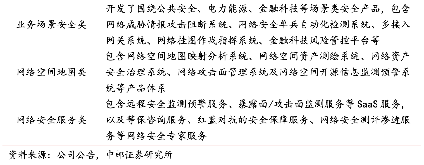 經(jīng)典案例:根據(jù)公司公告、中郵證券研究所等綜合資訊表明,盛邦安全為客戶提供網(wǎng)絡(luò)安全基礎(chǔ)類、業(yè)務(wù)場(chǎng)景安全類、網(wǎng)絡(luò)空間地圖類安全產(chǎn)品及服 務(wù)。公司研發(fā)的網(wǎng)絡(luò)安全產(chǎn)品種類繁多,包括防火墻、入侵檢測(cè)與防御、安全網(wǎng)關(guān)、安全管理 系統(tǒng)等,這些產(chǎn)品具有良好的安全性能和穩(wěn)定性,能夠滿足不同客戶對(duì)網(wǎng)絡(luò)安全的需求。