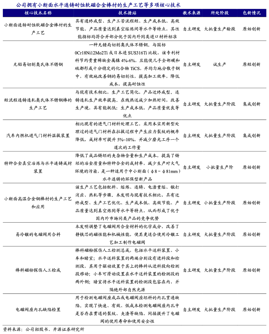 經典案例:根據公司招股書、開源證券研究所等綜合資訊表明,金則利歷經多年自主研發(fā),已形成了小斷面水平連鑄耐蝕軟磁合金棒材的生產 工藝等具有自主知識產權的核心技術。憑借多年通過小 斷面水平連鑄技術生產小批量特種合金的創(chuàng)新及產業(yè)化應用,公司在生產耐蝕軟磁 合金、耐熱鋼及高溫合金領域積累了獨特的技術優(yōu)勢,擁有多項核心技術。