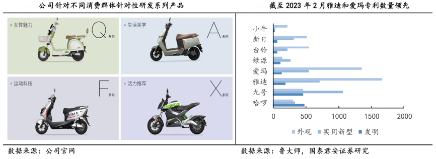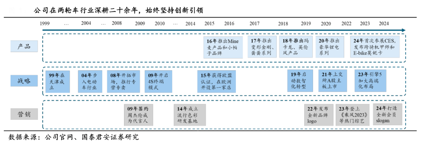 經(jīng)典案例:根據(jù)公司官網(wǎng)、國(guó)泰君安證券研究等綜合資訊表明,2015年愛瑪科技公司出口 國(guó)際市場(chǎng)并獲得歐盟認(rèn)證,2021年在 A 股上市,2022 年全年銷量突破 1000 萬(wàn)輛,并于 2023 年登上《乘風(fēng) 2023》等熱門綜藝。公司緊緊圍繞“用戶至上、卓越產(chǎn)品、精耕市場(chǎng)、精細(xì)運(yùn)營(yíng)”的戰(zhàn)略主軸和向數(shù)智化科技公司轉(zhuǎn)型的戰(zhàn)略方向,持續(xù)專注于電動(dòng)兩輪車研發(fā)與生產(chǎn)。