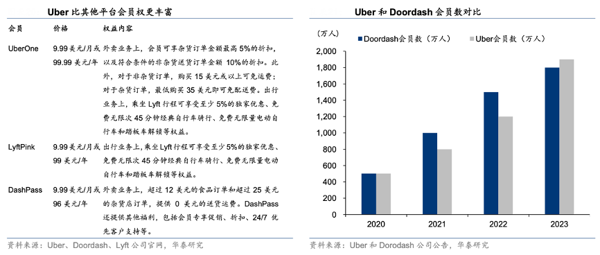 經(jīng)典案例:根據(jù)Uber、Doordash、Lyft公司官網(wǎng)、Uber和Doordash公司公告、華泰研究等綜合資訊表明,Uber 以會員制進行業(yè) 務(wù)間的深度綁定,在同樣的價格下權(quán)益內(nèi)容比其他單一平臺更為豐富,通過提供包括網(wǎng)約車和外賣在內(nèi)的多項服務(wù)優(yōu)惠(例如在外賣業(yè)務(wù)上會員可以享受訂單金額最高 5%的折扣;根據(jù) Uber2023 投資者日,Uber 會員用戶的消費是非會員用戶的 3.4 倍。