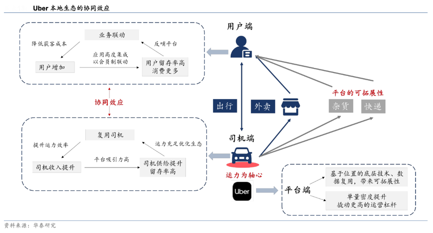 經(jīng)典案例:根據(jù)華泰研究等綜合資訊表明,相比于其競爭對手 Doordash(外賣)和 Lyft(出行)等僅從事一項業(yè)務(wù),Uber 以移動運力網(wǎng)絡(luò)的復用為基礎(chǔ),將外賣和出行業(yè)務(wù)整合,在司機端、用戶端和平臺端均帶來了更強的協(xié)同效應。
