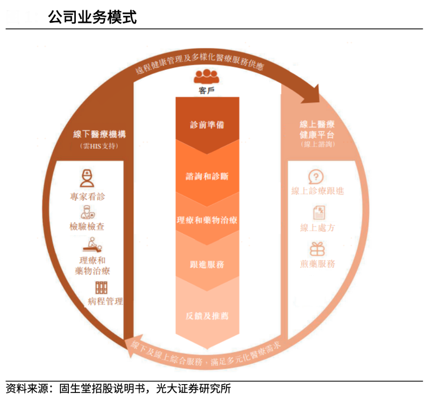 經(jīng)典案例:根據(jù)固生堂招股說明書、光大證券研究所等綜合資訊表明,固生堂以基礎(chǔ)醫(yī)療為重心,建立了線上醫(yī)療健康平臺與線下醫(yī)療機構(gòu)相結(jié)合的中醫(yī)平臺,并將中醫(yī)和西醫(yī)結(jié)合,為客戶提供貫穿疾病診療和醫(yī)療健康管理全過程的全面醫(yī)療健康解決方案。