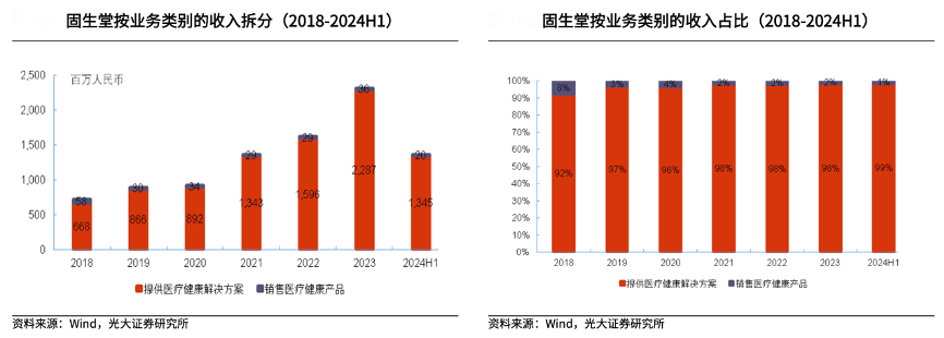 經(jīng)典案例:根據(jù)wind、光大證券研究所等綜合資訊表明,固生堂主要業(yè)務(wù)分為醫(yī)療健康解決方案和銷售醫(yī)療健康產(chǎn)品兩大板塊,其中醫(yī)療健康解決方案為收入主要來源。醫(yī)療健康解決方案服務(wù)包括提供診前準(zhǔn)備、優(yōu)質(zhì)的問診與診斷、理療、中醫(yī)處方及煎藥服務(wù)。提供醫(yī)療健康解決方案的收入占比由 2018 年的 92%提升至 2024H1 的 99%,呈逐年提升趨勢。
