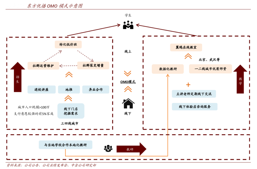 經(jīng)典案例:根據(jù)公司公告、公司業(yè)績發(fā)布會、中金公司研究部等綜合資訊表明,東方優(yōu)播通過地推、進校講座、異業(yè)合作等線下方式接觸當(dāng)?shù)厣?,進行低成本引流,繼而通過在線低價課將線下流量導(dǎo)入線上。在線上社群深度運營中進行用戶篩選和維護,提高正課轉(zhuǎn)化率,同時社群裂變也可以進一步擴大增量,形成線上招生渠道的自循環(huán)。