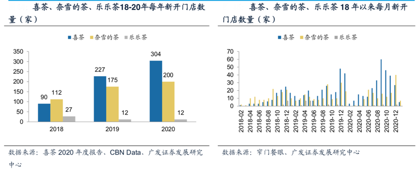 經典案例:根據喜茶2020年度報告、CBN Data、窄門餐眼、廣發(fā)證券發(fā)展研究中心等綜合資訊表明,在經歷了2015-17年新式茶飲消費者教育的階段后,喜茶和奈雪的茶迅速完成品牌認知和忠誠度的積累,在資本助力下開啟了快速開店的階段,2018年-20年喜茶新開門店90 家、227家、304家,截止21年1月,奈雪的茶在全國 共有513家門店。