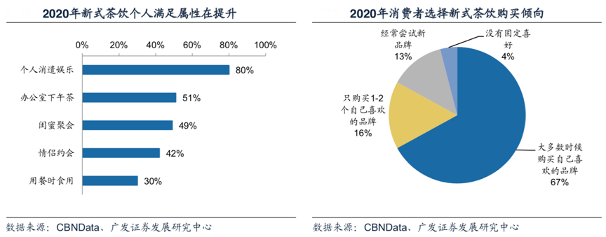 經典案例:根據CBNData、廣發(fā)證券發(fā)展研究中心等綜合資訊表明,根據大眾點評2019年數據,在不同餐飲品類中,飲品店點評熱度僅次于火鍋。根據CBNData,2020年消費者偏好的消費場景中,個人消遣娛樂達到 80%,茶飲的個人消費屬性有所強化。此外下午茶、閨蜜聚會、情侶約會、用餐也是茶飲消費的主要場景。消費者對品牌忠誠度在不斷提升,2020年大多數時候購買 自己喜歡的品牌的消費者占67%,只購買自己喜歡的1-2個品牌的消費者占16%。