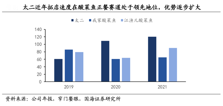 經(jīng)典案例:根據(jù)公司年報、窄門餐眼、國海證券研究所等綜合資訊表明,酸菜魚賽道快餐與正餐屬性并存,除頭部品牌太二外,江魚兒2019-2021年亦分別新開 79/64/90 家。而太二作為酸菜魚正餐龍頭,則憑借優(yōu)秀的單店模型+強(qiáng)品牌影響力,在后疫情時期實(shí)現(xiàn)了門店數(shù)量優(yōu)勢進(jìn)一步擴(kuò)大。