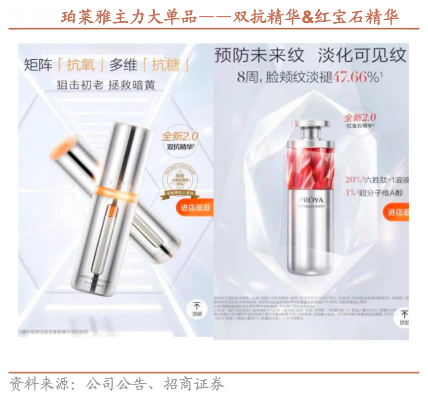 經(jīng)典案例:根據(jù)公司官網(wǎng)、天貓、招商證券等綜合資訊表明,珀萊雅2020 年開始打造大單品,紅寶石精華和雙抗精華分別在抗初老和抗糖抗氧功效上與其他競品形成差異化競爭。